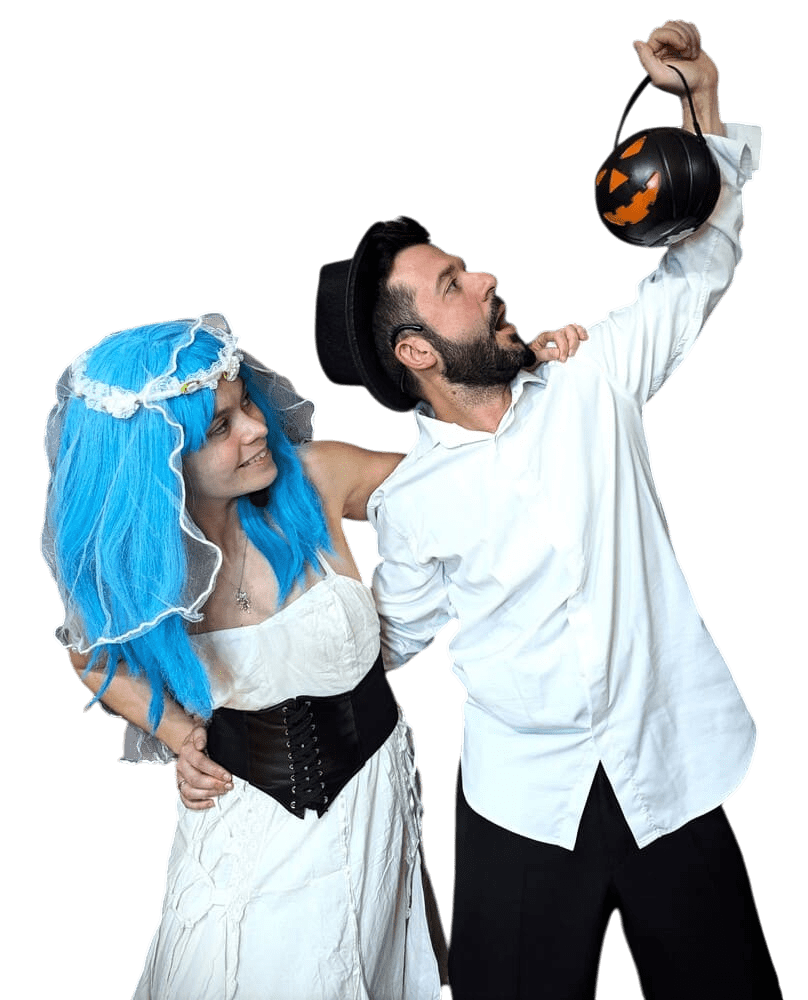 Presentamos a los icónicos personajes de la novia y el novio cadáver, quienes han resurgido de sus tumbas para celebrar la boda que nunca pudieron llevar a cabo en vida.